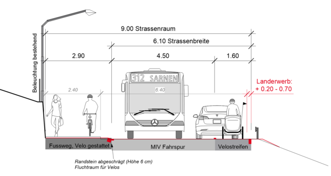 2021 - 24 | Der Strassenraum im Dorfkern von Kerns wird von verschiedenen Nutzungen geprägt. Die Strasse erschliesst den Dorfkern und verbindet Kerns mit Kägiswil, Stans, Stöckalp, Sachseln, Sarnen und der A8. Gleichzeitig wird sie intensiv vom Fuss- und Veloverkehr genutzt. Gestaltung, Querungsmöglichkeiten und Lärmemissionen beeinflussen die Wohn- und Aufenthaltsqualität wesentlich. Ein Betriebs- und Gestaltungskonzept soll klären, wie der Strassenraum so organisiert werden kann, dass die verkehrliche Funktion erhalten bleibt und zugleich Sicherheit und Aufenthaltsqualität steigen. Eine klare, übersichtliche Gestaltung soll zudem sicherstellen, dass sich alle Verkehrsteilnehmer – insbesondere Kinder und Schüler – sicher bewegen können und die gegenseitige Akzeptanz gestärkt wird.